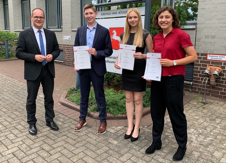 Jeweils 900 Punkte erreicht haben Lara Geermann vom Otto-Hahn-Gymnasium Gifhorn und Klara Schäfer von der Freien Waldorfschule Oldenburg. Mit 895 Punkten ist Bela Brandwein vom beruflichen Gymnasium der Berufsbildenden Schulen 2 in Hannover der drittbeste Abiturient in Niedersachsen in diesem Jahr.Kultusminister Grant Hendrik Tonne