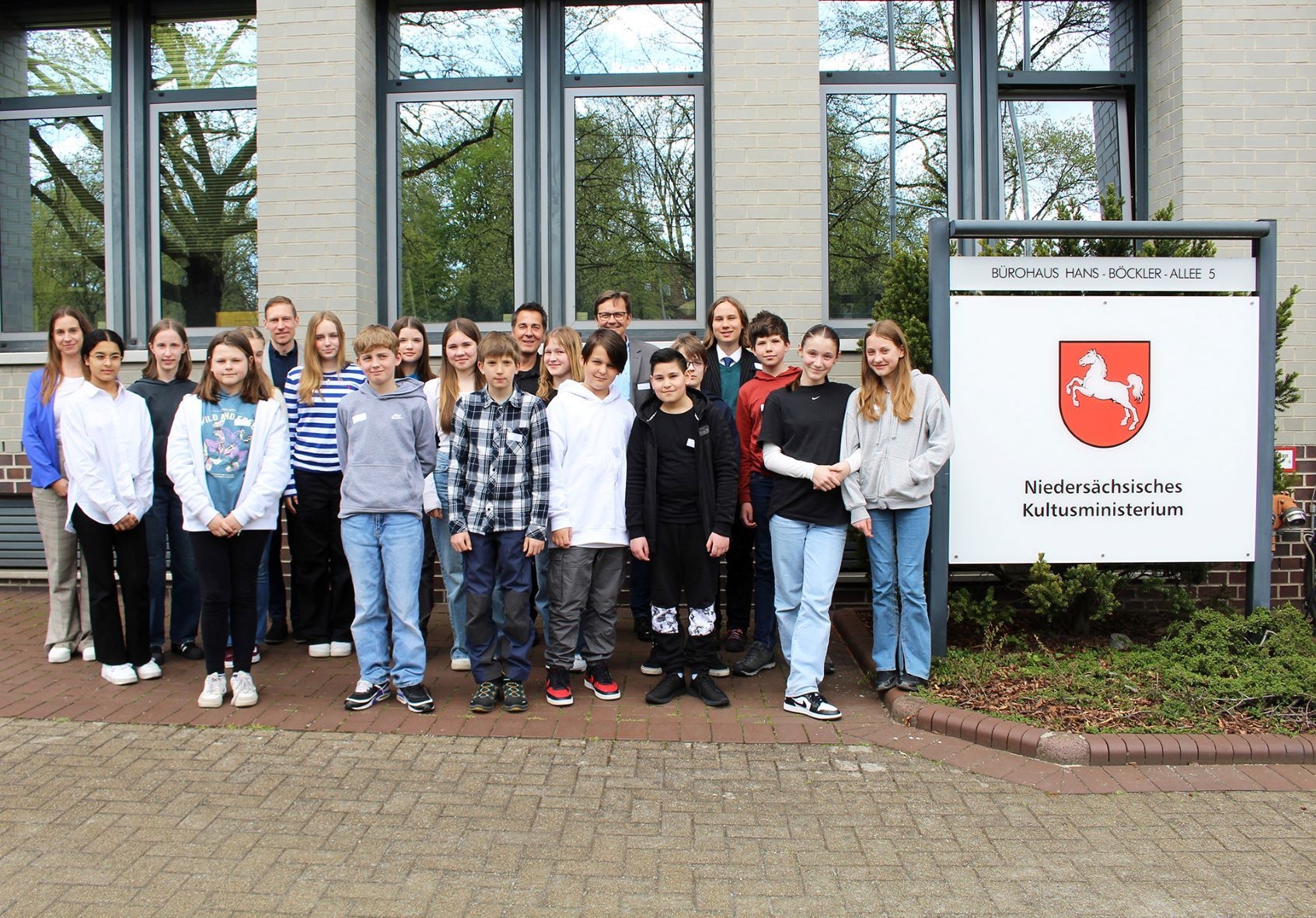Wie sieht eigentlich der Alltag einer Ministerin aus? Warum fängt die Schule immer schon um 8 Uhr und nicht später an? Und warum lernt man in der Schule kaum etwas über Steuern und Geldkonten? Das sind nur einige der vielen Fragen, mit denen 18 Schülerinnen und Schüler am heutigen Donnerstag Niedersachsens Kultusministerin Julia Willie Hamburg an ihrem Arbeitsplatz im 4. Stockwerk des Kultusministeriums löcherten.