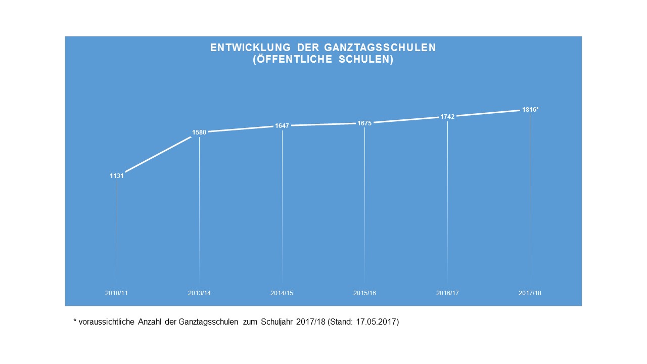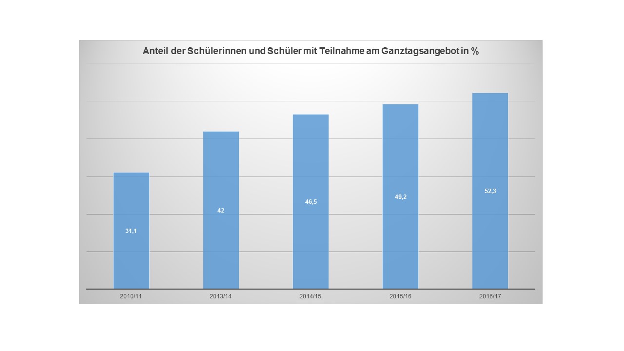 Dieser Fortschritt wird auch durch die Entwicklung des Zusatzbedarfes Ganztag belegt: Lagen die zusätzlichen Stunden für die Gestaltung der schulischen Ganztagsangebote im Schuljahr 2010/11 noch bei etwa 44.630 Stunden, stehen im Schuljahr 2016/2017 bereits ca. 78.340 Stunden zur Verfügung.