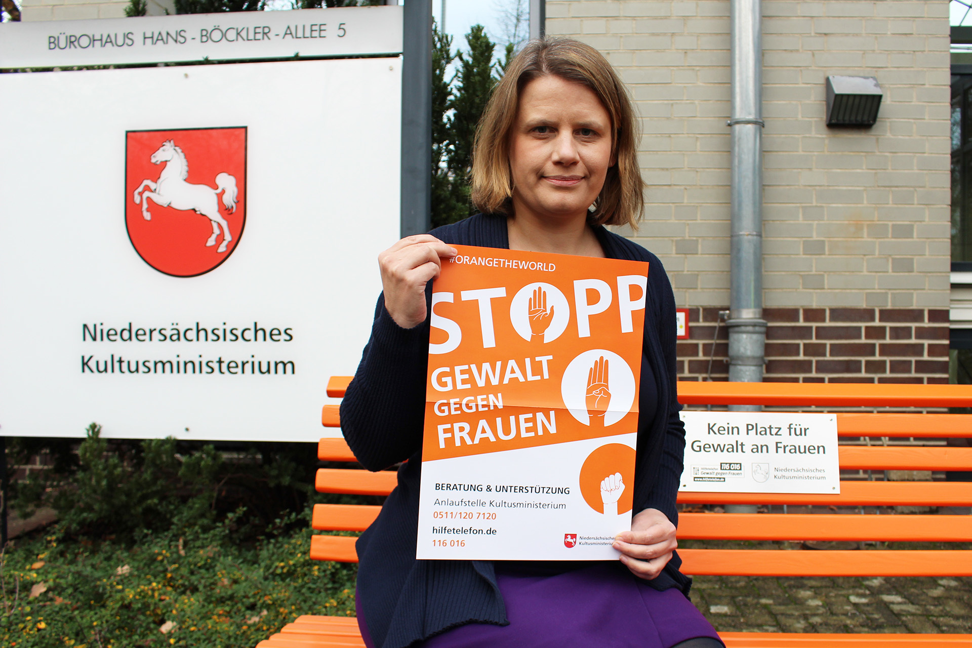 Am morgigen Samstag, den 25.11.2023, startet der zweiwöchige Aktionszeitraum „Orange The World“. Die Kampagne, die von den Vereinten Nationen ins Leben gerufen wurde, macht seit 1991 auf die Gewalt gegen Frauen aufmerksam. Die Farbe Orange wird dabei symbolisch als alarmierende Farbe genutzt, die auf die ebenso alarmierenden gesellschaftlichen Zustände aufmerksam machen und in eine Zukunft ohne Gewalt weisen soll. Auch die Niedersächsische Landesregierung beteiligt sich an der Aktion. Das Kultusministerium hat hierfür eine orangefarbene Bank angeschafft, die ab sofort neben dem Haupteingang des MK-Gebäudes steht. Zugleich weisen Flaggen vor dem Ministerium auf den „Orange Day“ hin. Darüber hinaus hat Kultusministerin Julia Willie Hamburg alle Schulen in Niedersachsen zu Aktionen, wie z.B. Projekttage oder der Gestaltung von Plakaten, in diesem Zeitraum aufgerufen. Das Kultusministerium hat ihnen hierfür ein Plakat zur Verfügung gestellt, das auf bestehende Hilfsangebote verweist.
