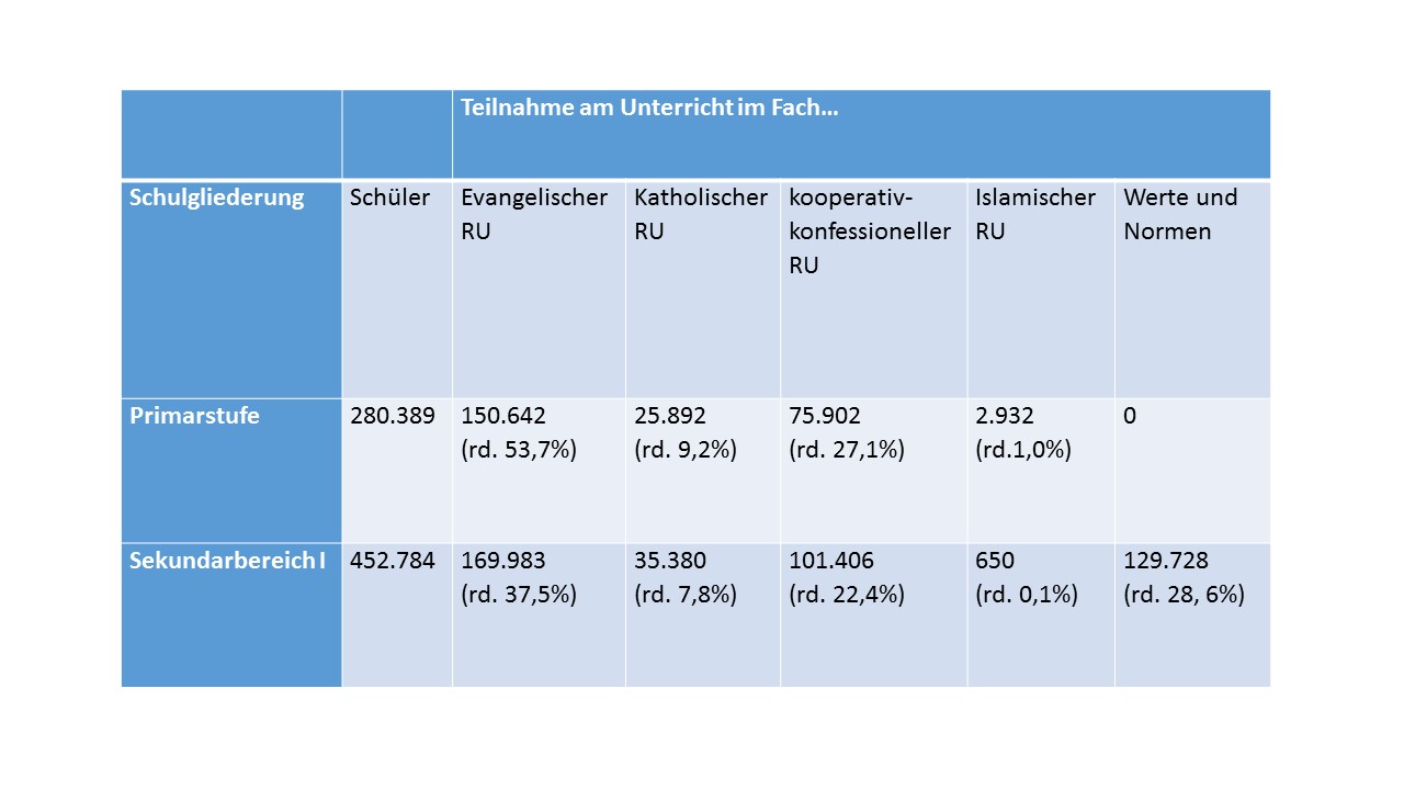 - An öffentlichen Grundschulen nehmen im laufenden Schuljahr 2016/2017 rund 91 Prozent der Schülerinnen und Schüler an einem Religionsunterricht teil (255.368 von 280.389 Schülerinnen und Schülern). An öffentlichen Schulen des Sekundarbereichs I nehmen im laufenden Schuljahr 2016/2017 rund 28 Prozent der Schülerinnen und Schüler am Unterricht im Fach Werte und Normen teil (129.728 von 452.784 Schülerinnen und Schülern):