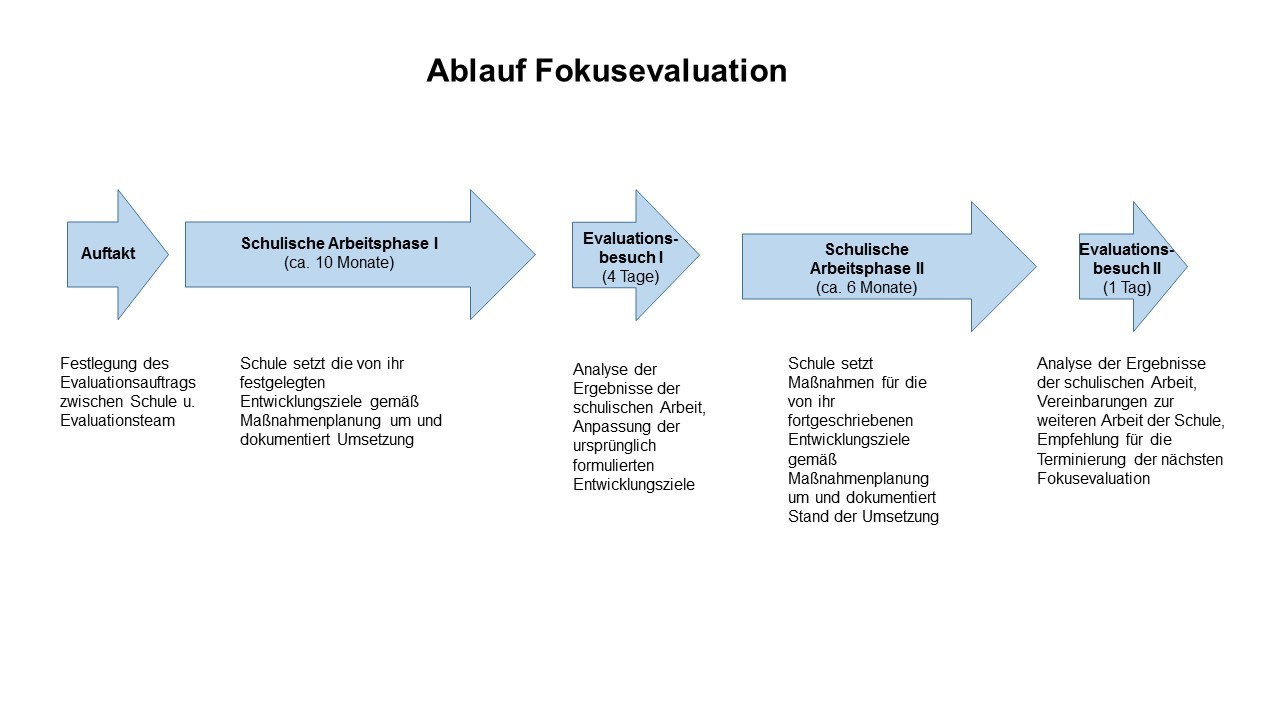Um das Verfahren so gut wie möglich an den Bedürfnissen der einzelnen Schule auszurichten, sind für die Schulen große Mitgestaltungsmöglichkeiten vorgesehen. Im Fokus der Evaluation steht der Unterricht. Die Schule wählt aus, welche ihrer unterrichtsbezogenen Entwicklungsziele evaluiert werden sollen. Infrage kommen Ziele, die sich fachbezogenen und fächerübergreifenden Schwerpunktthemen zuordnen lassen. Die fachbezogenen und fächerübergreifenden Schwerpunktthemen werden den Bedarfen der Schulen entsprechend stetig erweitert. Für die Schwerpunktthemen sind standardisierte Instrumente entwickelt worden, mit denen Unterrichtsqualität bewertet werden kann. Das Verfahren läuft in mehreren Phasen ab. U.a. sind zwei längere schulische Arbeitsphasen vorgesehen, auf die jeweils ein Besuch des Evaluationsteams an der Schule folgt (s. Abbildung).