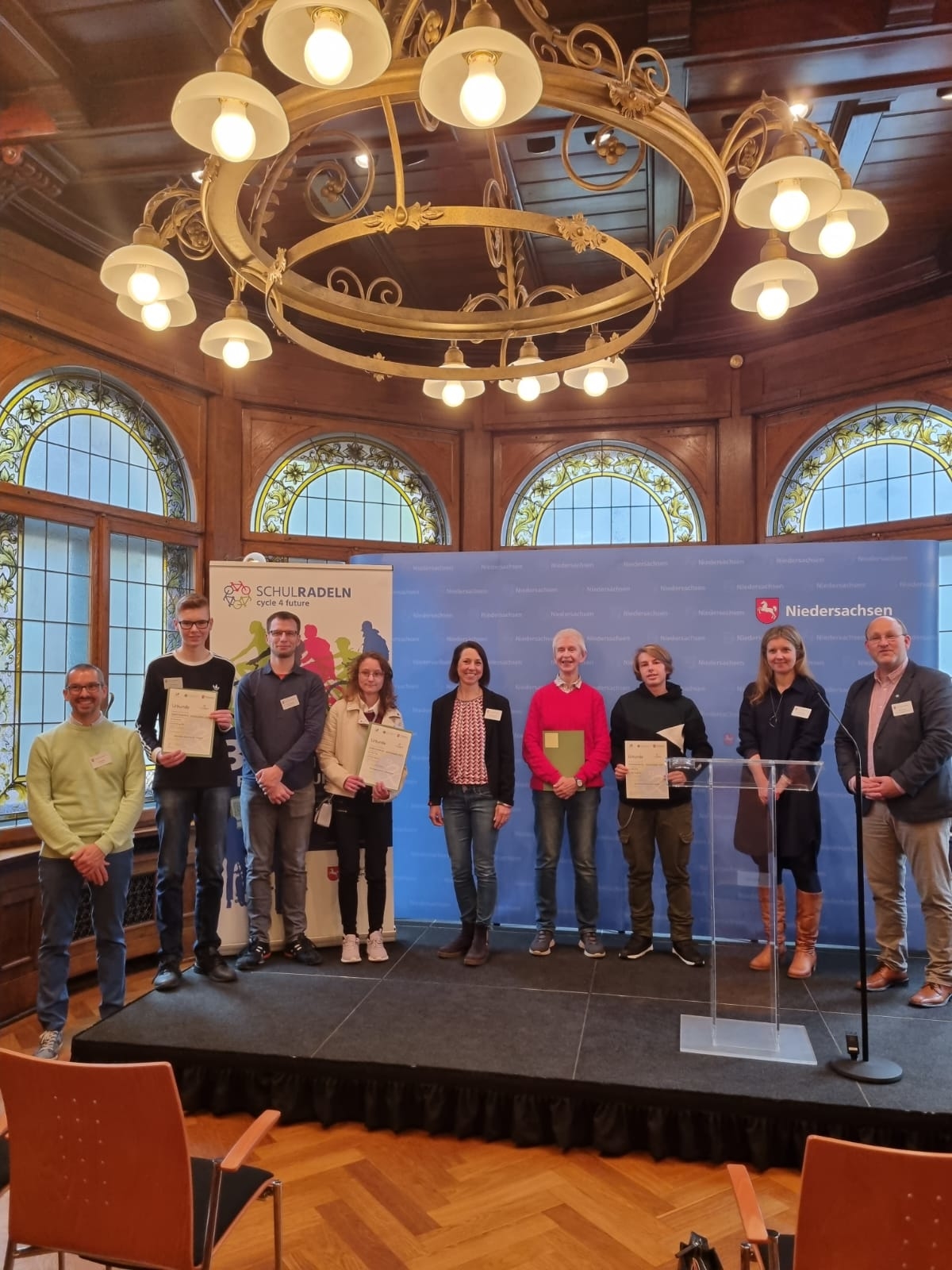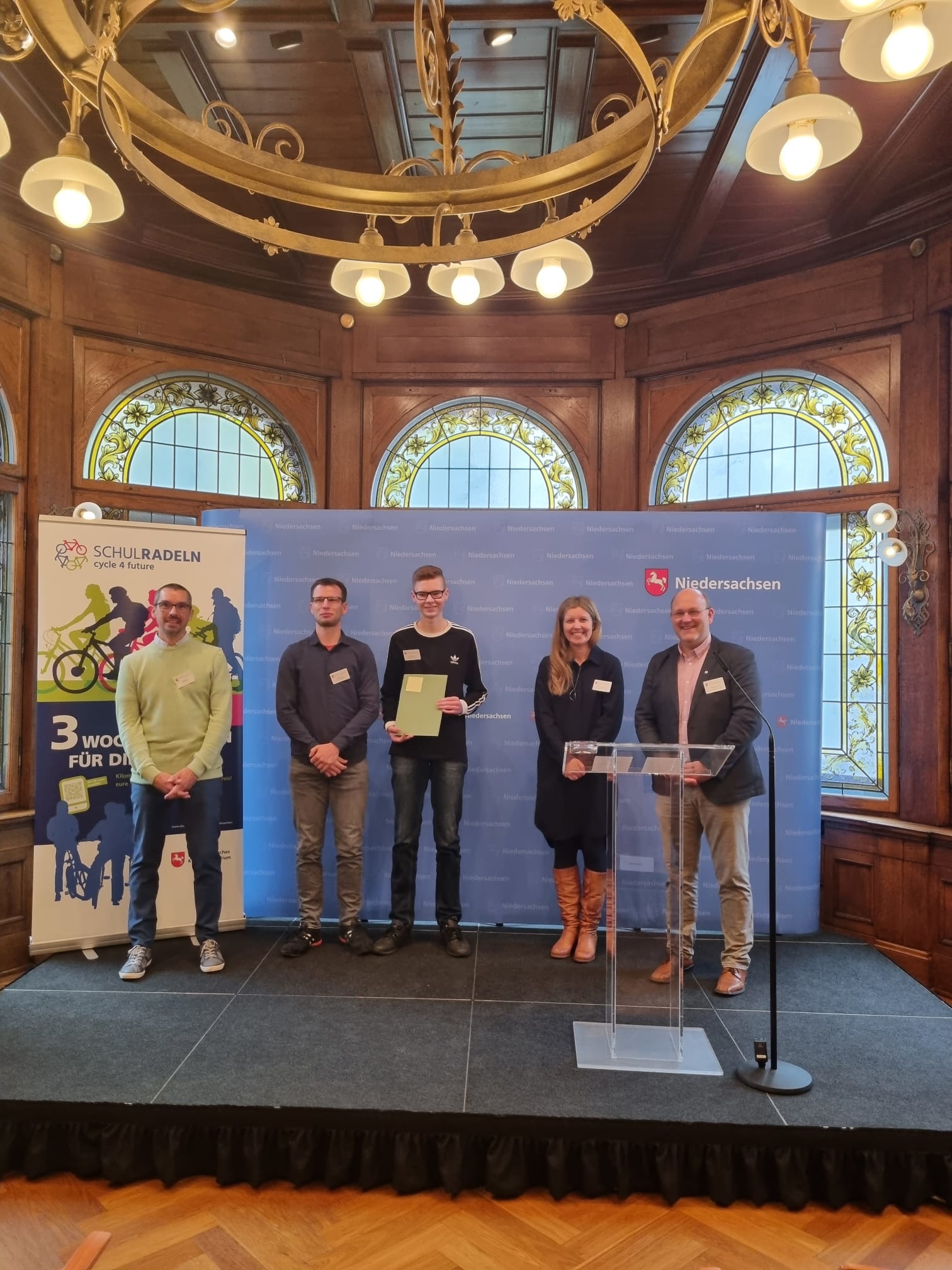 Am heutigen Freitag (5.11.21) fand im Gästehaus der Landesregierung die Preisverleihung zum Wettbewerb „Schulradeln in Niedersachsen“ statt. Die Preise wurden vom Kultusministerium vergeben. Eine Auszeichnung erhielten jeweils die ersten drei Schulen, die im Aktionszeitraum die meisten Fahrradkilometer gesammelt haben, die meisten Kilometer je Teilnehmende oder die mit dem größten Team angetreten waren. Sie bekamen einen Gutschein im Wert von 500, 300 und 200 Euro überreicht. Die Gutscheine können beispielsweise für Fahrradaktionen oder Fahrradwerkstätten an den Schulen eingesetzt werden.