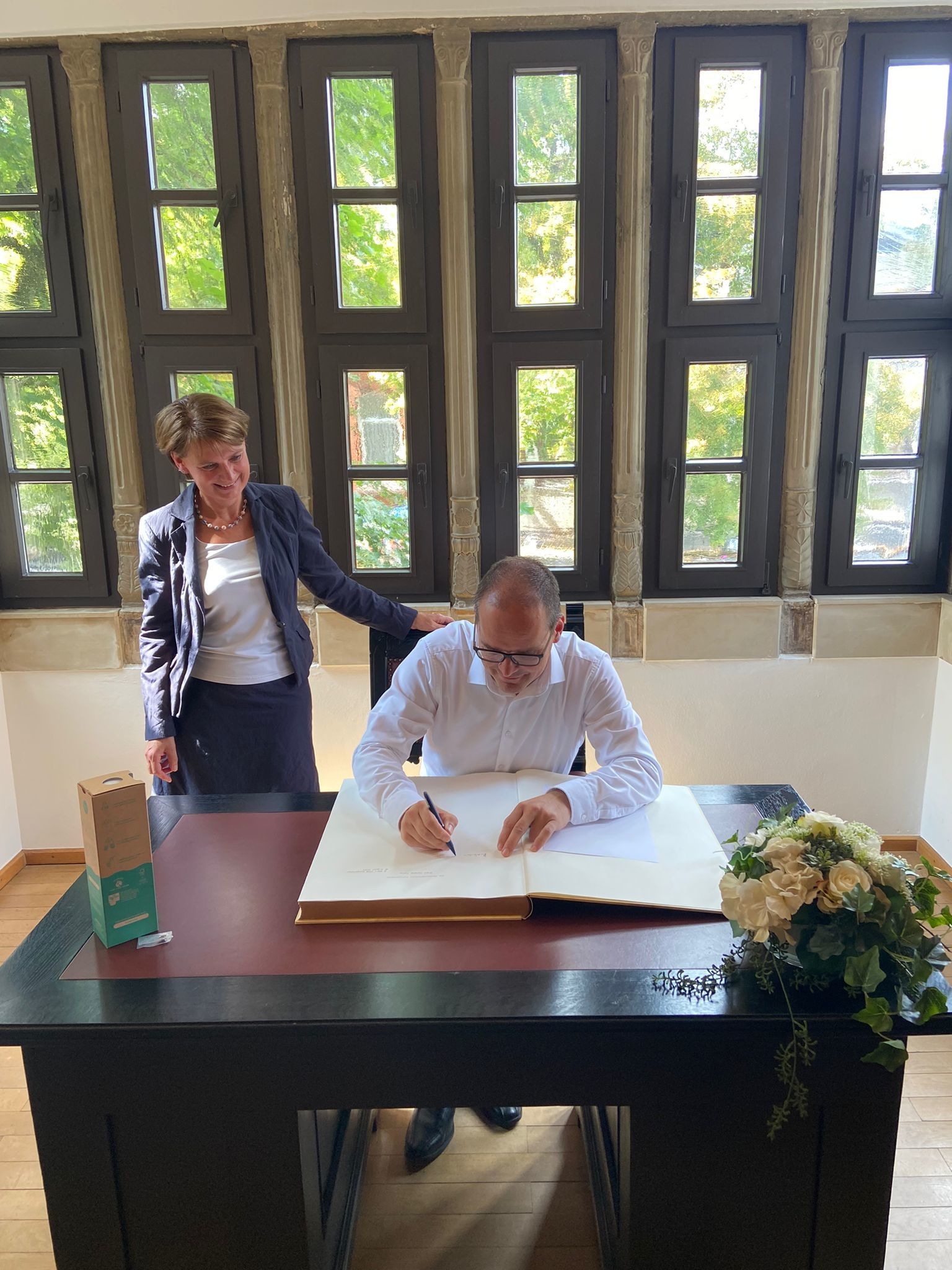 Kultusminister Grant Hendrik Tonne (rechts) trägt sich im Beisein der Ersten Stadträtin Dr. Maren Fröhlich (links) in das Goldene Buch der Stadt Nienburg ein.