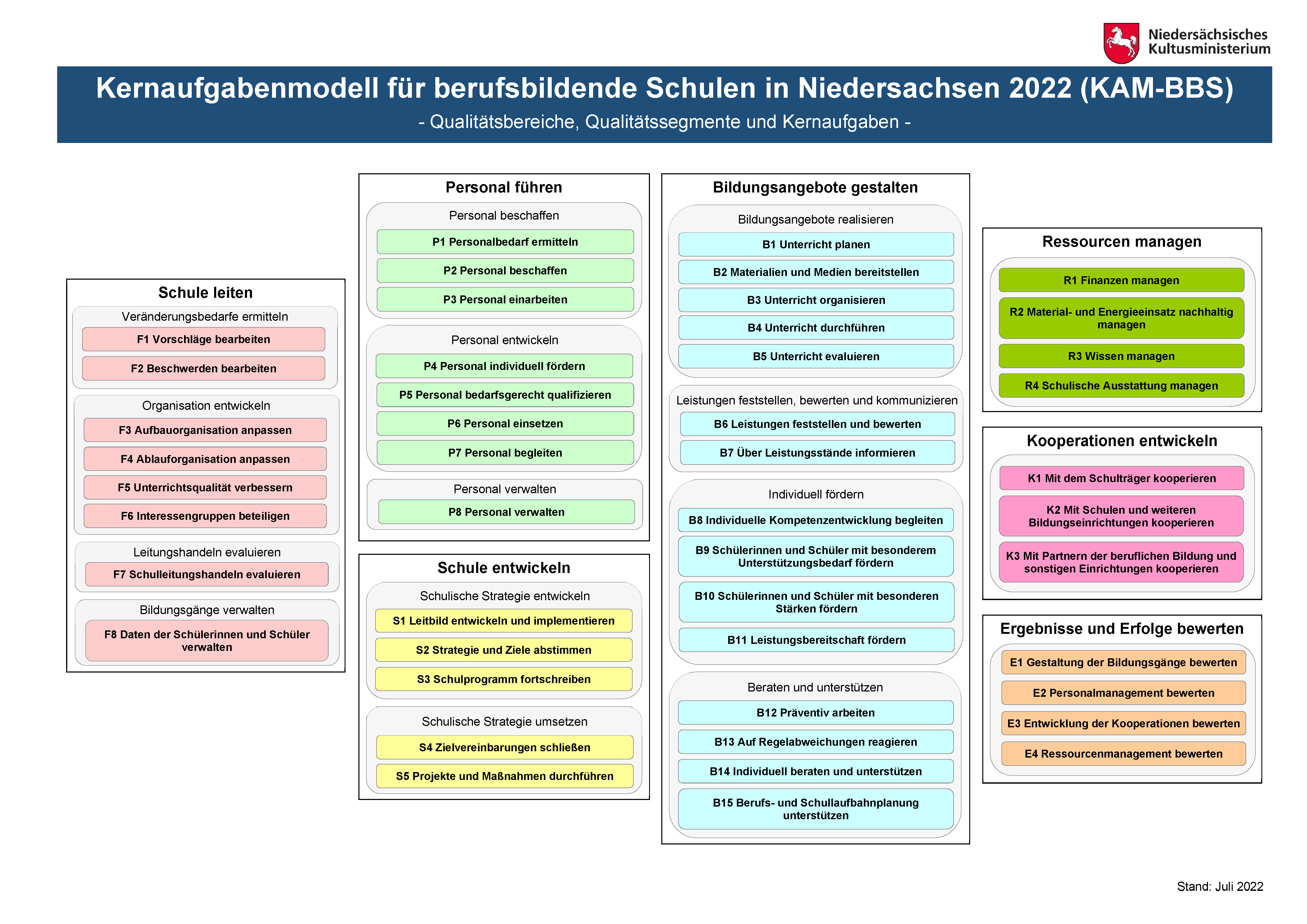 Das verbindliche Kernaufgabenmodell für berufsbildende Schulen (KAM-BBS) 2022 als wesentlicher Bestandteil des Qualitätsmanagementsystems BBS in Niedersachsen ist direkt verzahnt mit dem Strategischen Handlungsrahmen-BBS 2022. Die sieben Qualitätsbereiche des KAM-BBS 2022 können in den vier strategischen Handlungsfeldern des Strategischen Handlungsrahmens abgebildet werden. Allen Qualitätsbereichen sind jeweils verbindliche Kernaufgaben zugeordnet, die zentrale Prozesse oder Aufgaben in Schule fokussieren